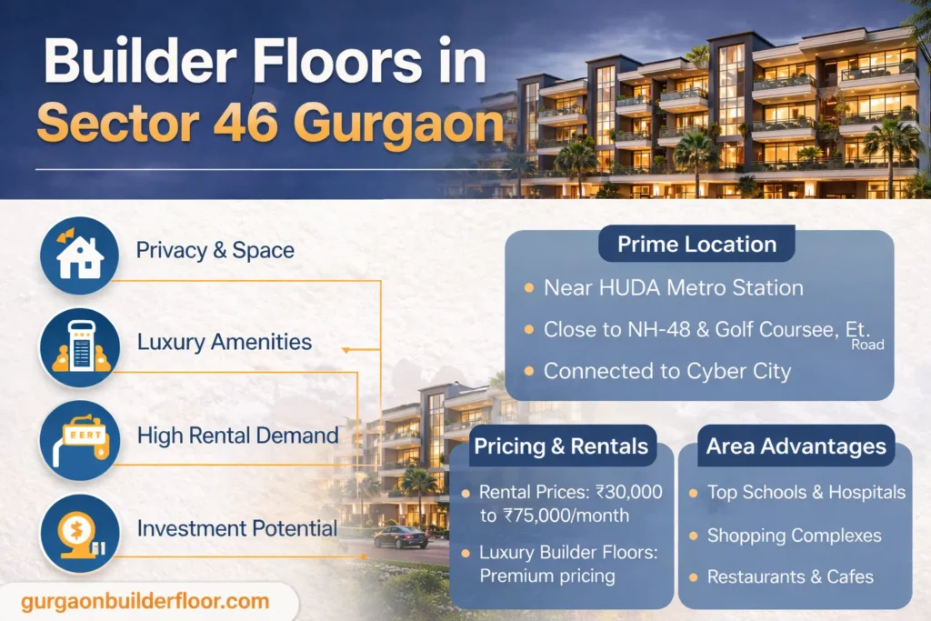 Builder floors in Sector 46 Gurgaon offer a perfect combination of independent living, modern features, and a prime city location. With excellent connectivity, strong infrastructure, and growing real estate demand, this area remains one of the best options for buyers looking for premium homes in Gurgaon.